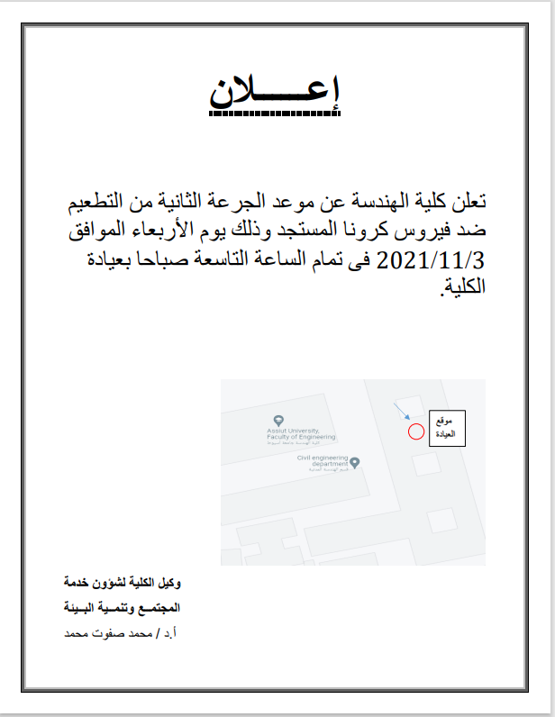 تعلن كلية الهندسة عن موعد الجرعة الثانية من التطعيم ضد فيروس كرونا المستجد وذلك يوم الأربعاء الموافق 3/11/2021 فى تمام الساعة التاسعة صباحا بعيادة الكلية.