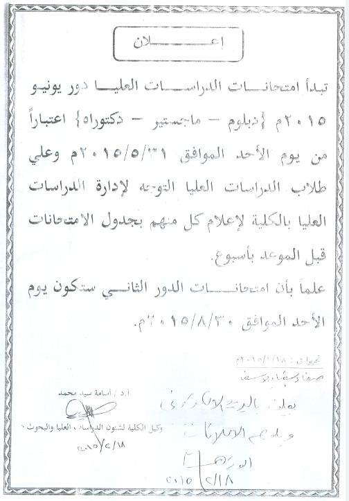 موعد امتحانات دور يونيو 2015 للدراسات العليا 19 فبراير 2015 موعد امتحانات دور يونيو 2015 للدراسات العليا