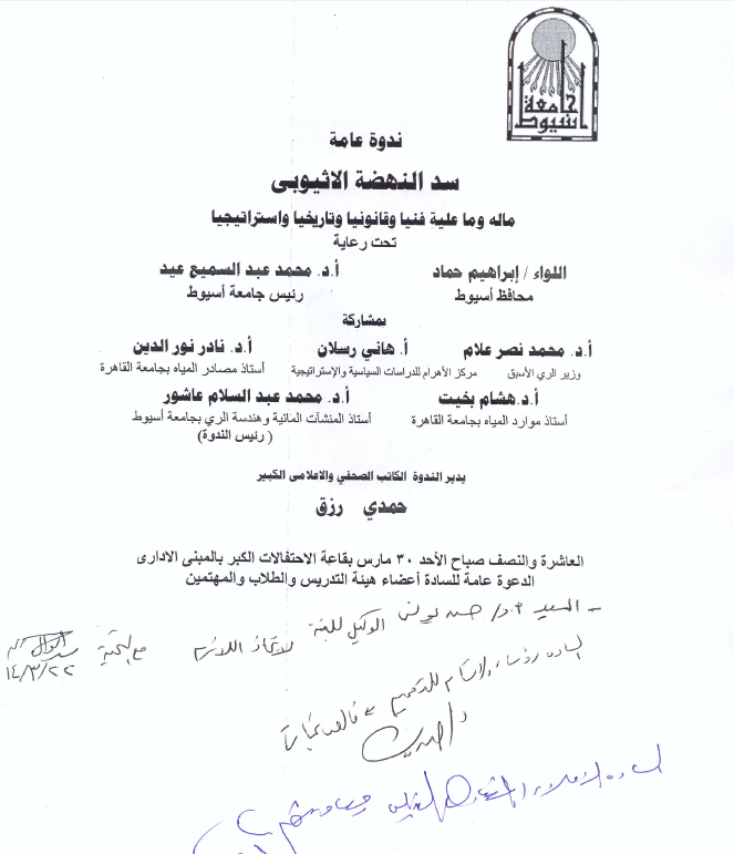 ندوة عامة عن سد النهضة الأثيوبى ما له وما عليه 26 مارس 2014 ندوة عامة عن سد النهضة الأثيوبى ما له وما عليه يدير الندوة الكاتب الصحفى/ حمدى رزق فى العاشرة والنصف صباح الأحد 30 مارس بقاعة الإحتفالات الكبرى بالمبنى الإدارى الدعوة عامة للسادة أعضاء هيئة التدريس والطلاب والمهتمين