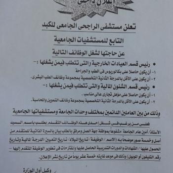 تعلن مستشفى الراجحى الجامعى للكبد التابع للمستشفيات الجامعية عن حاجتها لشغل الوظائف التالية: