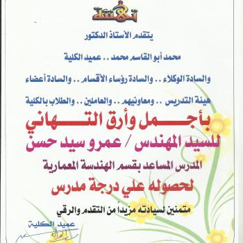 سوف تعقد بمشيئة الله تعالى مناقشة رسالة الدكتوراة المقدمة من المهندس/ عمرو سيد حسن