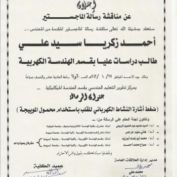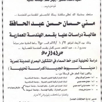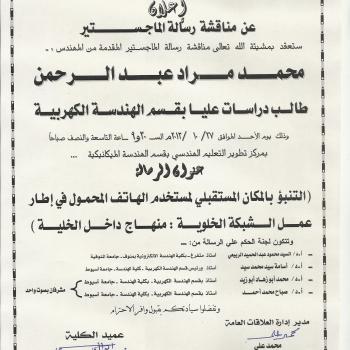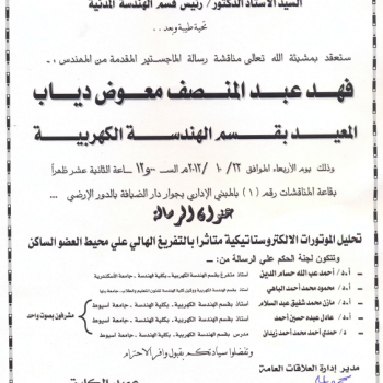 …سوف تعقد بمشيئة الله تعالى مناقشة رسالة الماجستيرالمقدمة من المهندس