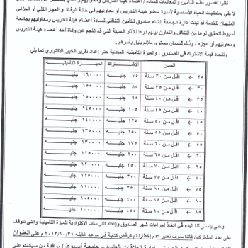 قد قررت ادارة الجامعة انشاء صندوق التامين التكافلى للسادة اعضاء هيئة التدريس ومعاونيهم بجامعة اسيوط لتحقيق نوعا من التكافل والتعاون وذلك نظرا للتامينات…