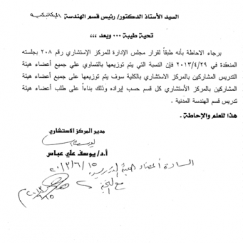 توزيع النسب بالتساوى على السادة اعضاء هيئة التدريس المشاركين بالمركز الإستشارى طبقاً للقرار الخاص بمجلس ادارة المركز