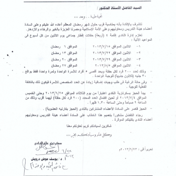 تهنئة من عميد كلية الهندسة والسادة الوكلاء والسادة رؤساء الأقسام الى اعضاء هيئة التدريس والعاملين والطلاب بمناسبة حلول شهر رمصان…