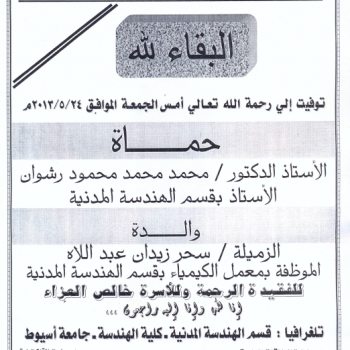 وفاة حماة الدكتور محمد محمد محمود رشوان…