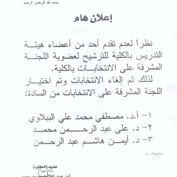 انتخاب اللجنة المشرفة على الإنتخابات بالكلية يوم 27/5/2013 بقاعة مجلس الكليةفبرجاء من السادة أعضاء هيئة التدريس والهيئة المعاونة الكرام…