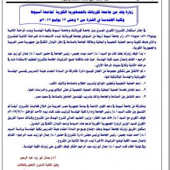 في إطار استكمال المشروع الكوري بين جامعة كورياتك وكلية الهندسة بجامعة أسيوط وبدء المرحلة الثانية يونيو 2017- مايو 2018، زار جامعة أسيوط أربعة من المسئولين بجامعة كورياتك لبدء الإستعدادات للمرحلة…