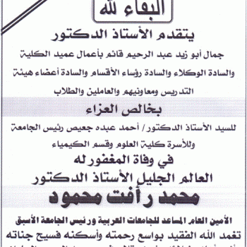 عزاء واجب فى وفاة رئيس الجامعة الاسبق الأستاذ الدكتور / محمد رأفت محمود