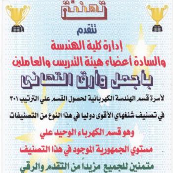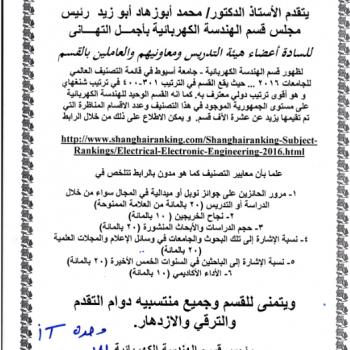 يتقدم الأستاذ الدكتور محمد أبوزهاد رئيس مجلس قسم الهندسة الكهربائية بأجمل التهانى للسادة أعضاء هيئة التدريس و معاونيهم و العاملين بالقسم لظهور القسم فى التصنيف…