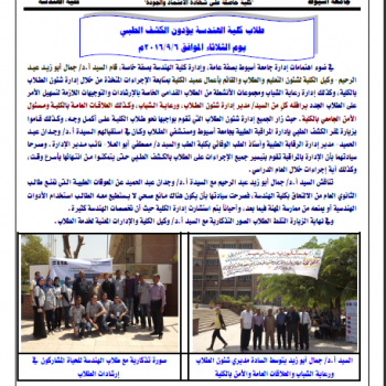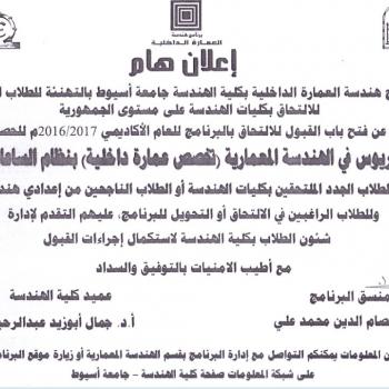 يتقدم برنامج هندسة العمارة الداخلية بكلية الهندسة جامعة أسيوط بالتهنئة للطلاب الجدد المقبولين للإلتحاق بكليات الهندسة على مستوى الجمهورية ويعلن عن فتح باب القبول للإلتحاق بالبرنامج للعام…