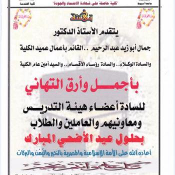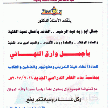 يتقدم الأستاذ الدكتورجمال أبوزيد عبدالرحيم القائم بأعمال عميد الكلية, و السادة الوكلاء ,والسادة رؤساء الأقسام بأجمل وأرق التهانى للسادة أعضاء هيئة التدريس ومعاونيهم و…