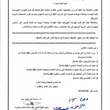 طبقاً لما ورد بالتصنيف العالمى للأقسام العلميةلعام 2016 فإن قسم الهندسة الكهربائية بجامعة أسيوط قد حصل على الترتيب 301 فى ترتيب شنغهاى و هو من اقوى التصنيفات الدولية المعروفة. و…