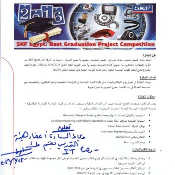 جائزة أفضل مشروع تخرج (2015/2016) لطلاب كلية الهندسة من شركة إس كى إف إيجيبت - تحت رعاية السيد نقيب المهندسين