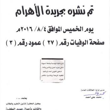 أسرة كلية الهندسة تنعى والدة الدكتور / النوبى أحمد ابراهيم