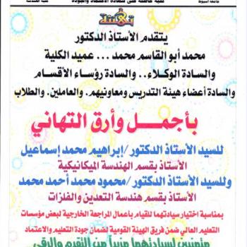 تهنئة من كلية الهندسة لكلاً من السيد الأستاذ الدكتور إبراهيم محمد إسماعيل - والسيد الأستاذ الدكتور محمود محمد احمد محمد