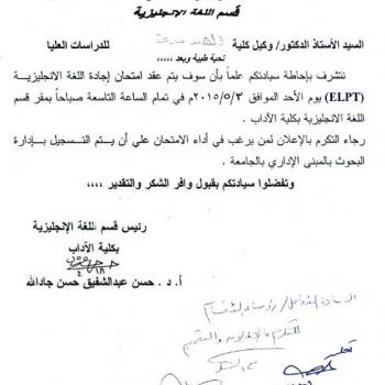 سوف يعقد امتحان اللغة الإنجليزية ELpt يوم الأحد الموافق 3-5-2015م فى تمام الساعة التاسعة صباحاً بمركز اللغة الإنجليزية