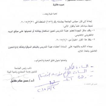 إيماءاً الى قرار مجلس الجامعة المنعقد فى 31/3/2015 فقد تقرر الآتى:
