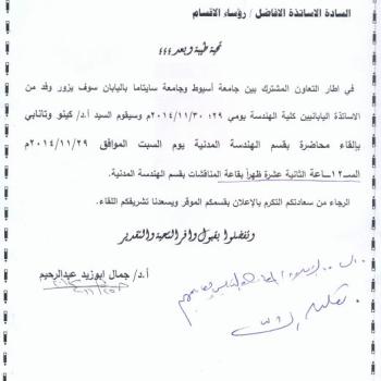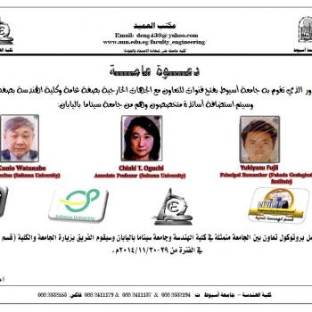 فى اطار التعاون المشترك بين جامعة أسيوط وجامعة سايتاما باليابان سوف يزور وفد من الأساتذة اليابانيين كلية الهندسة يومى 29-30/11/2014 م…
