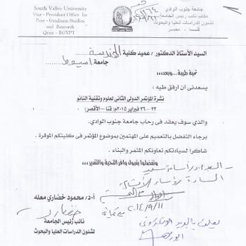 سوف يعقد بمشيئة الله المؤتمر الدولى الثانى لعلوم وتقنية النانو من 23-26 فبراير 2015 م ( قنا -الأقصر) فى رحاب جامعة جنوب الوادى…