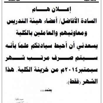 السادة الأفاضل/ أعضاء هيئة التدريس ومعاونهيم بالكليةتحية طيبة وبعديسعدني أن أحيط سيادتكم علماً بأنه سيتم صرف مرتب شهر سبتمبر2014م…