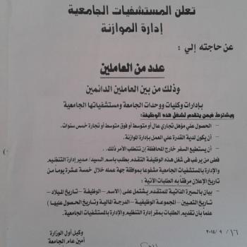 تعلن ادارة الموازنة بالمستشفيات الجامعية عن حاجتها لعدد من العاملين من بين العاملين الدائمين بإدارات وكليات ووحدات الجامعة ومستشفياتها…