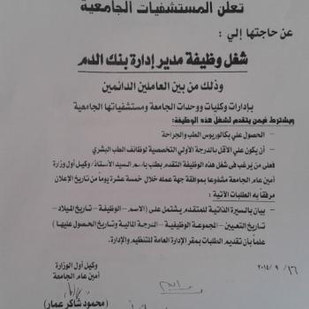 …تعلن المستشفيات الجامعية عن حاجتها لشغل وظيفة مدير ادارة بنك الدم وذلك من بين العاملين الدائمين بادارات ووحدات الجامعة ومتشفياتها…