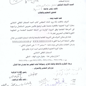 بناء على الخطاب الموجه من السيد المستشار الثقافى الإعلامى بسفارة كوريا الجنوبية بالقاهرة الى نائب رئيس الجامعة ومنه الى السيد عميد كلية…