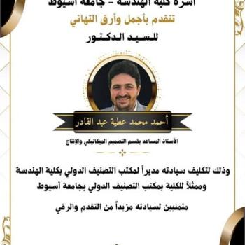 أعلن الاستاذ الدكتور خالد صلاح عميد الكلية عن تكليف الدكتور أحمد محمد عطية الاستاذ المساعد بقسم هندسة التصميم الميكانيكي والإنتاج بالكلية للعمل مديرا لمكتب التصنيف الدولي بالكلية،…