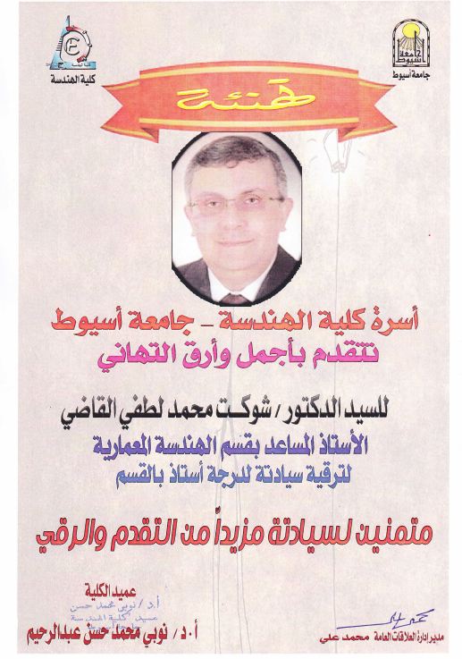 تهنئة من أسرة كلية الهندسة بمناسبة تعيين الدكتور/ شوكت محمد لطفى القاضى ـــ استاذ بقسم الهندسة المعمارية