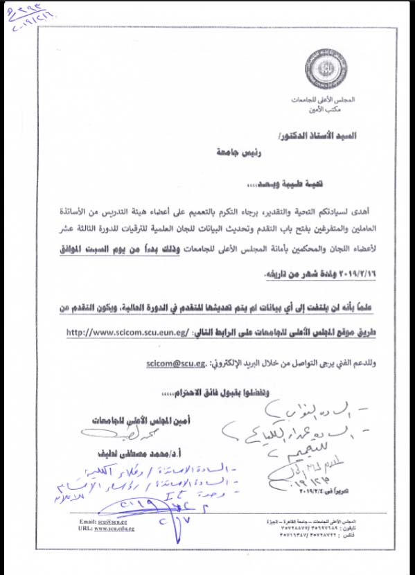 فتح باب التقدم وتحديث البيانات للجان العلمية للترقيات للدورة الثالة عشر لأعضاء اللجان والمحكمين بأمانة المجلس الأعلى للجامعات بدءا من يوم السبت الموافق 16/2/2019 ولمدة شهر من تاريخه