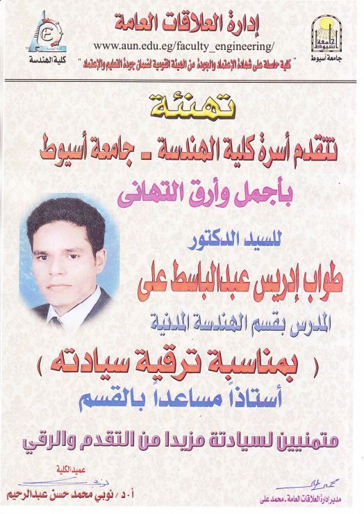 تهنئة من أسرة كلية الهندسة بمناسبة تعيين الدكتور/ طواب ادريس ـــ استاذ مساعد 16 يناير 2019 تهنئة من أسرة كلية الهندسة بمناسبة تعيين الدكتور/ طواب ادريس ـــ استاذ مساعد