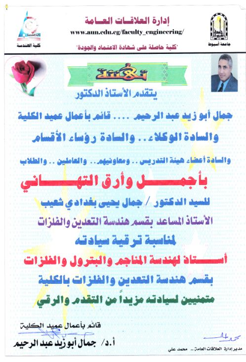 يتقدم السيد الأستاذ الدكتور/ جمال أبوزيد عبدالرحيم القائم بأعمال عميد الكلية والسادة الوكلاء والسادة رؤساء الأقسام بأجمل وأرق التهاني للسيد الدكتور / جمال يحى بغدادى شعيب بقسم هندسة التعدين والفلزات بمناسبة ترقيته الى استاذ دكتور لهندسة المناجم والبترول والفلزات بقسم هندسة التعدين والفلزات متمنين لسيادته مزيدا من التقدم والرقى