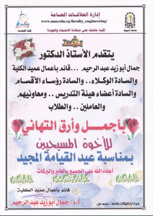 تتقدم أسرة كلية الهندسة بأرق وأجمل التهاني للأخوة المسيحيين بمناسبة عيد القيامة المجيد أعاده الله علي الجميع بالخير والبركات
