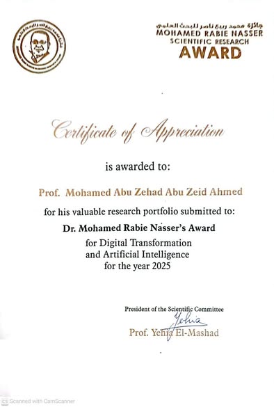 فوز الاستاذ الدكتور محمد ابوزهاد ابوزيد بجائزة محمد ربيع ناصر للبحث العلمي.بحضور م. إبراهيم محلب رئيس وزراء مصر الأسبق، والفريق كامل الوزير نائب رئيس الوزراء ووزير الصناعة ووزير النقل والمواصلات، ود. أسامة الأزهرى وزير الأوقاف، والاستاذ الدكتور مصطفي رفعت أمين المجلس الأعلى للجامعات، ومحافظي القاهرة والقليوبية، والعديد من الشخصيات العامة، تم اعلان وتوزيع جوائز محمد ربيع ناصر للبحث العلمي في دورتها الثامنة لعام 2025 للباحثين والعلماء من جمهورية مصر العربية والدول العـربية، حيث فاز الاستاذ الدكتور محمد ابوزهاد ابوزيد الاستاذ المتفرغ بقسم الهندسة الكهربائية ووكيل الكلية لشئون الدراسات العليا والبحوث سابقا، والاستاذ بالجامعة المصرية اليابانية حاليا بجائزة التحول الرقمي والذكاء الاصطناعي ، والذي يمثل احد مجالات الجائزة.