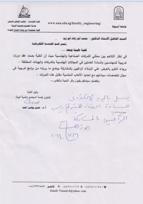 عقد دورات تدربية للمهندسين 7 يوليو 2014 ستقوم كلية الهندسة بالتعاون مع ممثلي الشركات الصناعية والهندسية بعقد دورات تدريبية للمهندسين والسادة العاملين في المجالات الهندسية بالشركات والهيئات المختلفة.