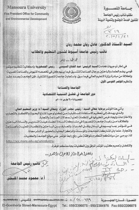 فى اطار توجيهات فخامة السيد الرئيس / عبد الفتاح السيسى --- رئيس الجمهورية بإمكانية تنظيم مؤتمر قومى يضم العلماء والباحثين ورجال الصناعة للتنسيق فيما بينهم كل فى تخصصه للنهوض بالصناعة المصرية وانطلاقاً من مبادرة وزارة التعليم العالى فيما سبق، واستجابة جامعة المنصورة للتنفيذ، فإن الجامعة بصدد عقد وتنظيم المؤتمر القومى الأول