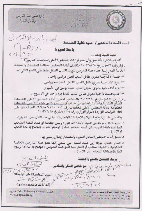 بناء على قرار المجلس الأعلى للجامعات بتكليف أمانة المجلس بمطالبة الجامعات والمعاهد الخاصة المعار اليها أعضاء هيئة التدريس بتوريد النسب المتفق عليها على النحو التالى :