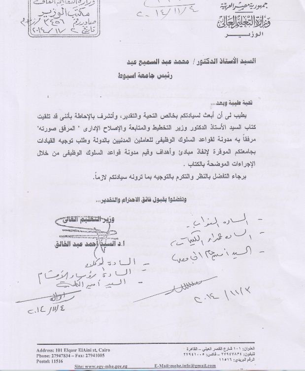 3- توزيع المدونة على القيادات العليا والوسطى بهدف ضبط السلوك الوظيفى وتحسين العلاقة بين الموظفين العمومين والمواطنين