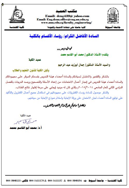بالــشكر والتقــدير والامتنــان لــسيادتكم والــسادة أعــضاء هيئــة التــدريس بقــسمكم المــوقر علــى مجهــوداتكم والـسادة أعـضاء هيئـة التـدريس فـي إنجـاز أعمـال الامتحانـات مـن إعـداد الأسـئلة والتـصحيح ورصـد الـدرجات بالفـصل الدراسي الثاني للعام الجامعي ٢٠١٥/٢٠١٤م والذي كان له مردود إيجابي على سرعة إظهار نتائج الطلاب. والشكر موصول للسادة رؤسـاء الكنتـرولات علـى مجهـوداتهم فـي اسـتكمال جميـع أعمـال الكنتـرول والتأكيـد على توقيع السادة أعضاء لجان الامتحان على ورقة الإجابة واستلام نموذج الإجابة من سيادتهم.