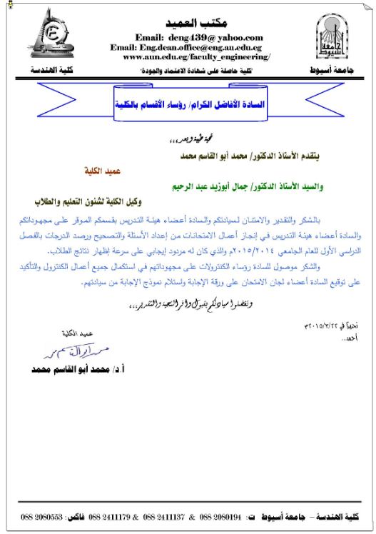 شكر وتقدير للسادة رؤساء الأقسام بكلية الهندسة 23 مارس 2015 شكر وتقدير للسادة رؤساء الأقسام بكلية الهندسة