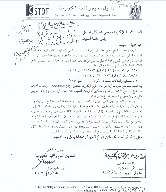 صندوق العلوم والتنمية التكنولوجية يعلن عن منح بحثية تطبيقية جديدة 7 مايو 2013 صندوق العلوم والتنمية التكنولوجية يعلن عن منح بحثية تطبيقية جديدة