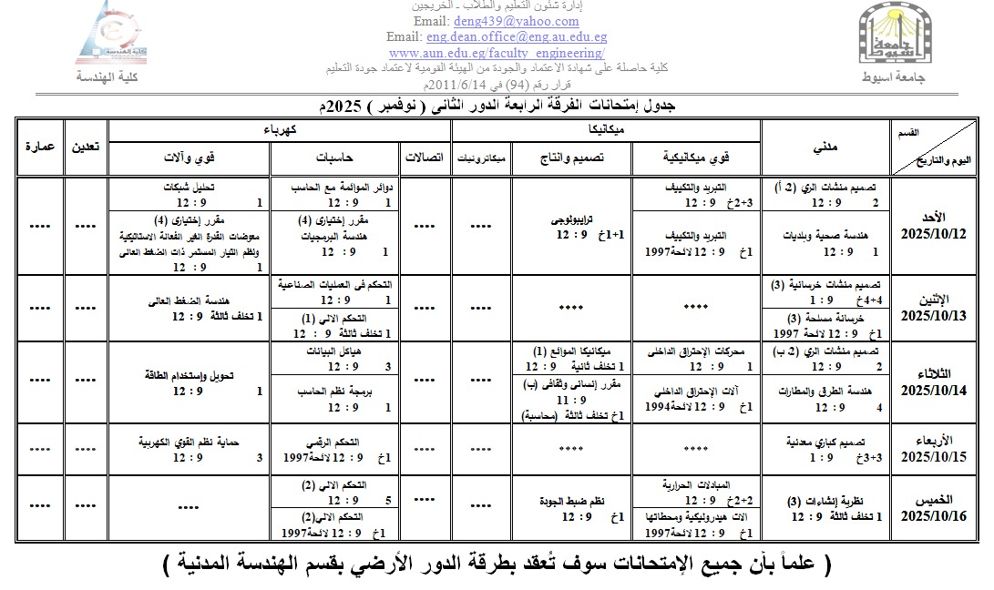 جدول امتحانات الفرقة الرابعة الدور الثاني ( نوفمبر ) 2025 م.