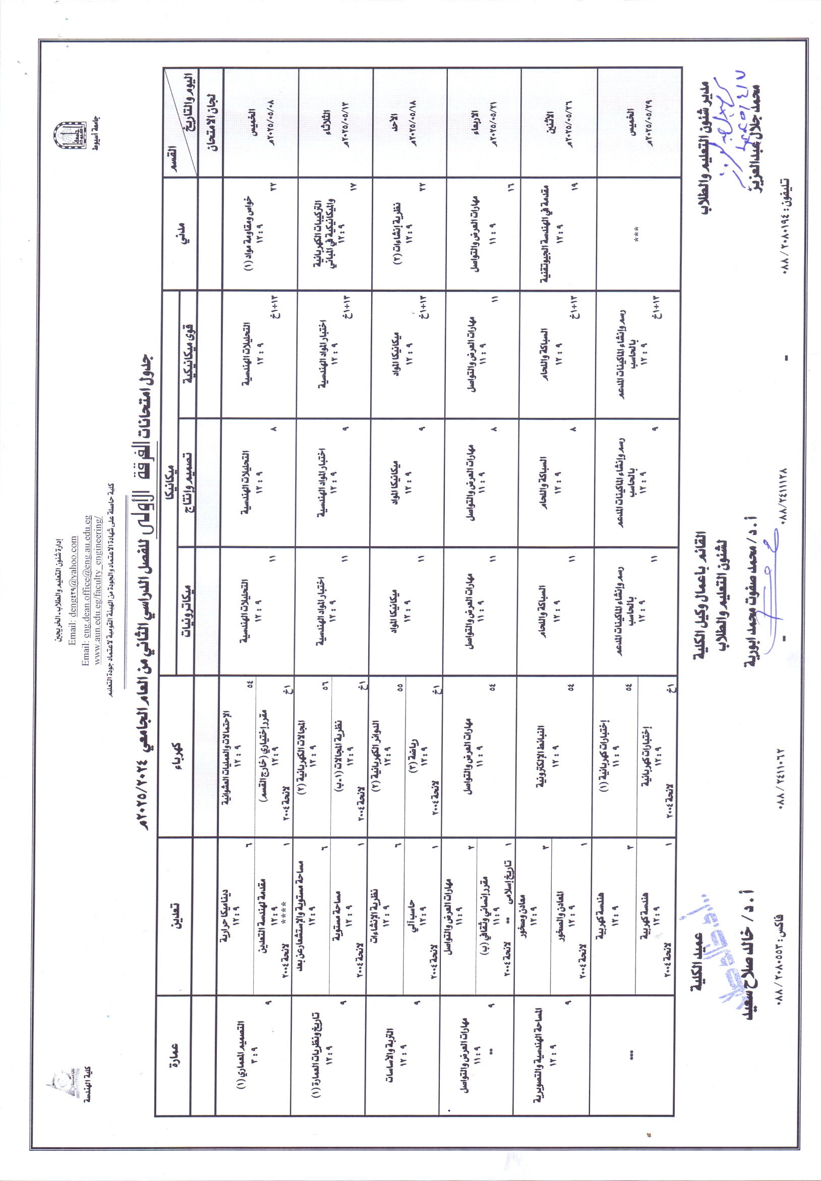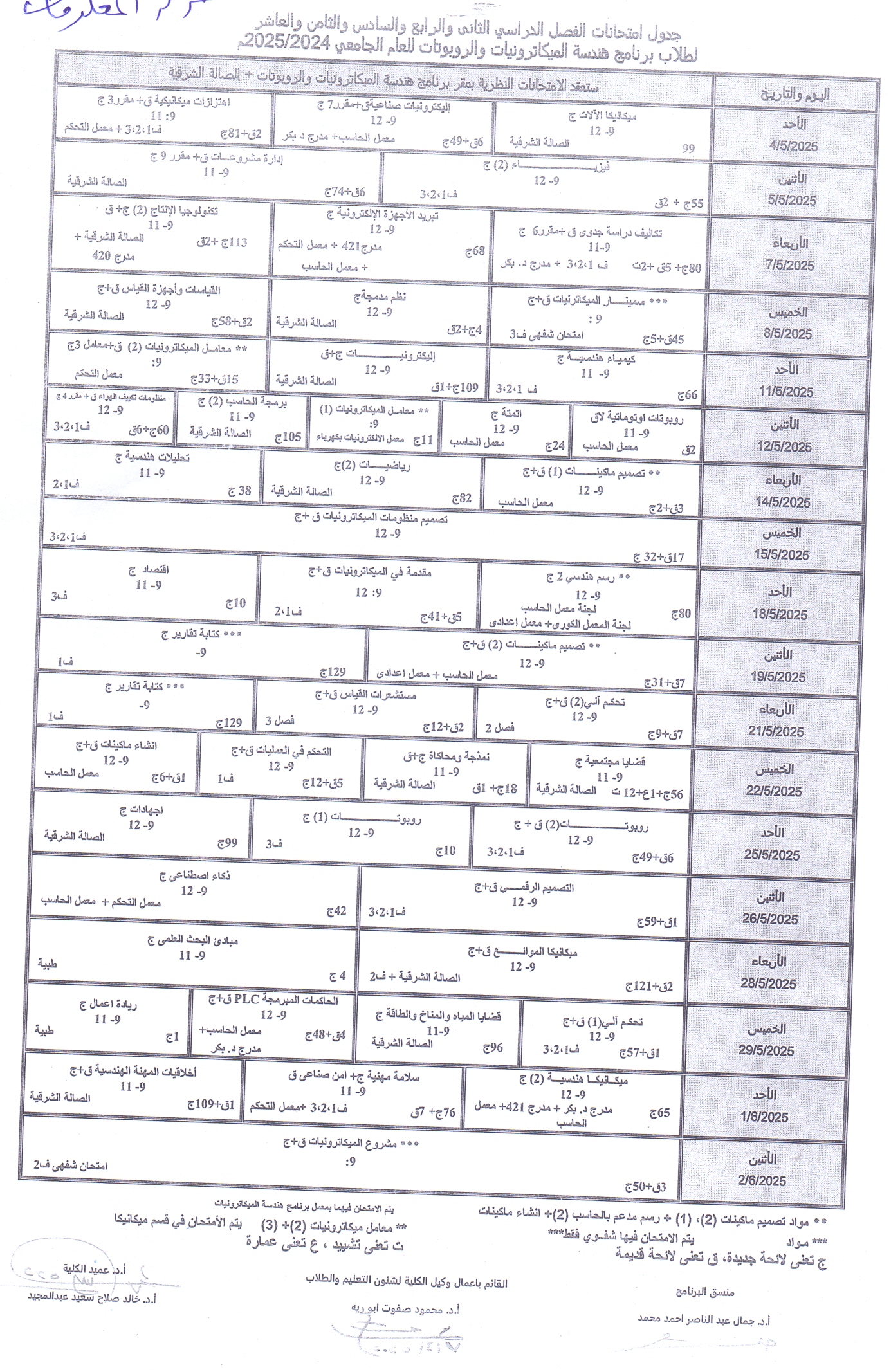 جدول امتحانات برنامج هندسة الميكاترونيات والروبوتات