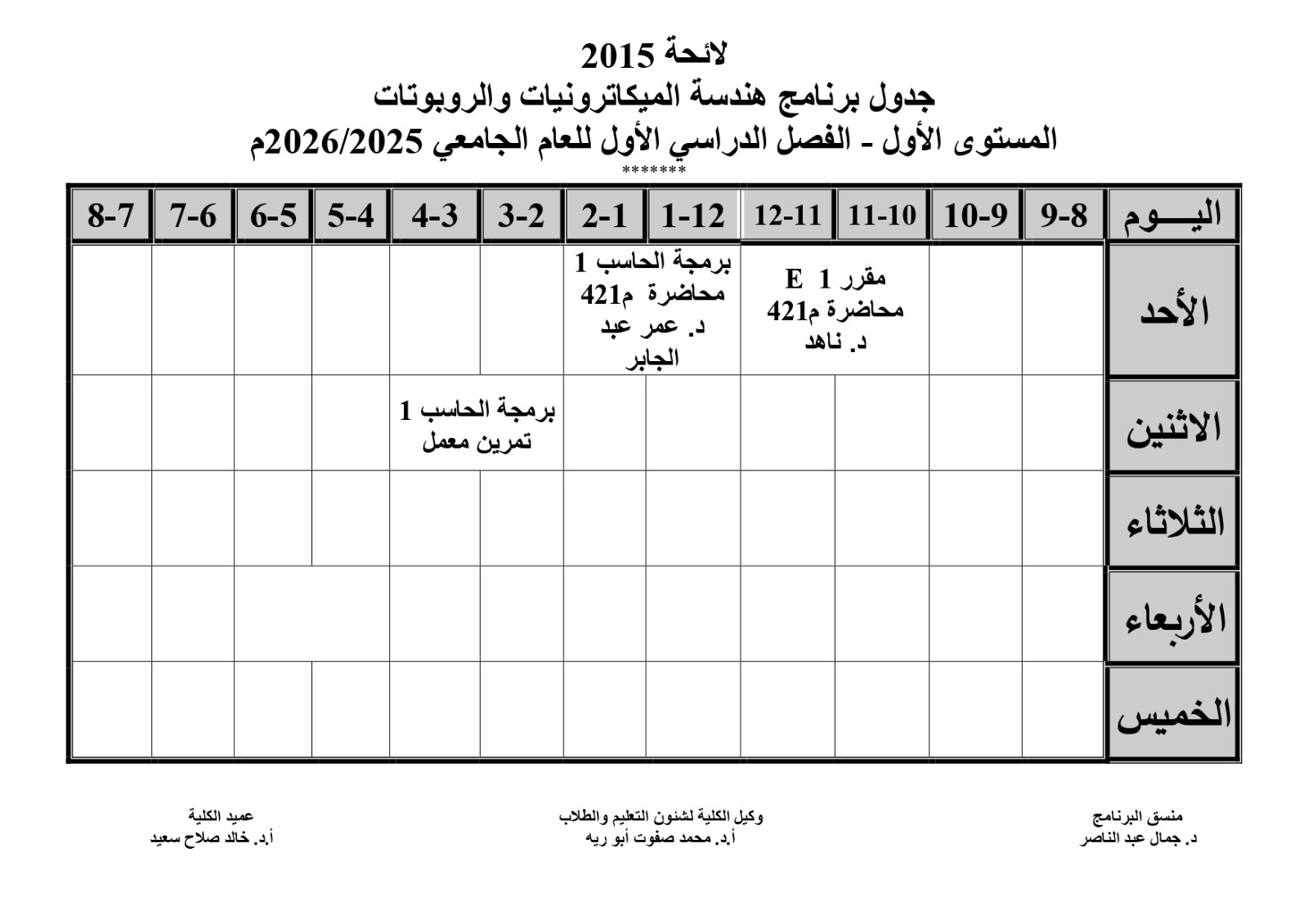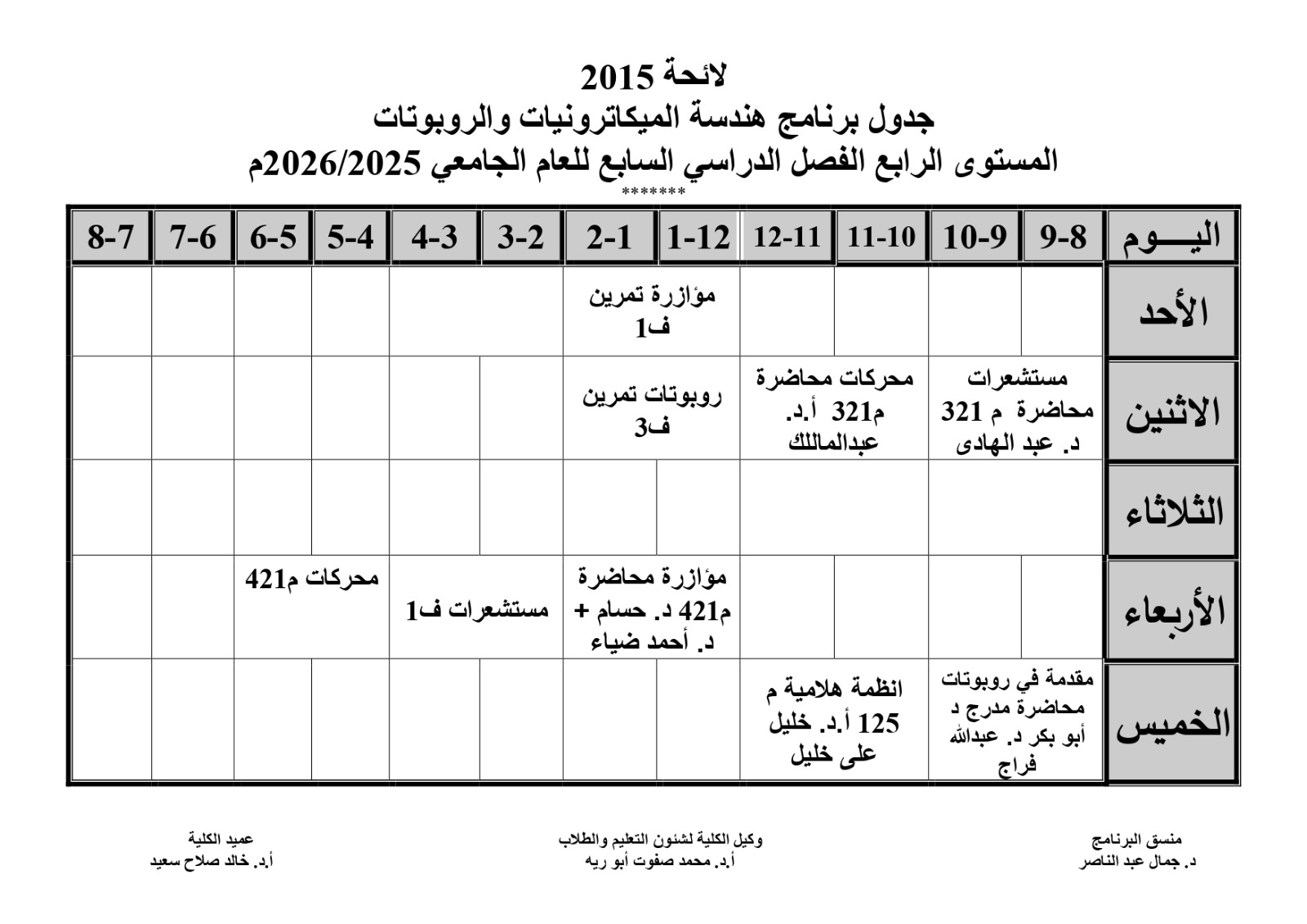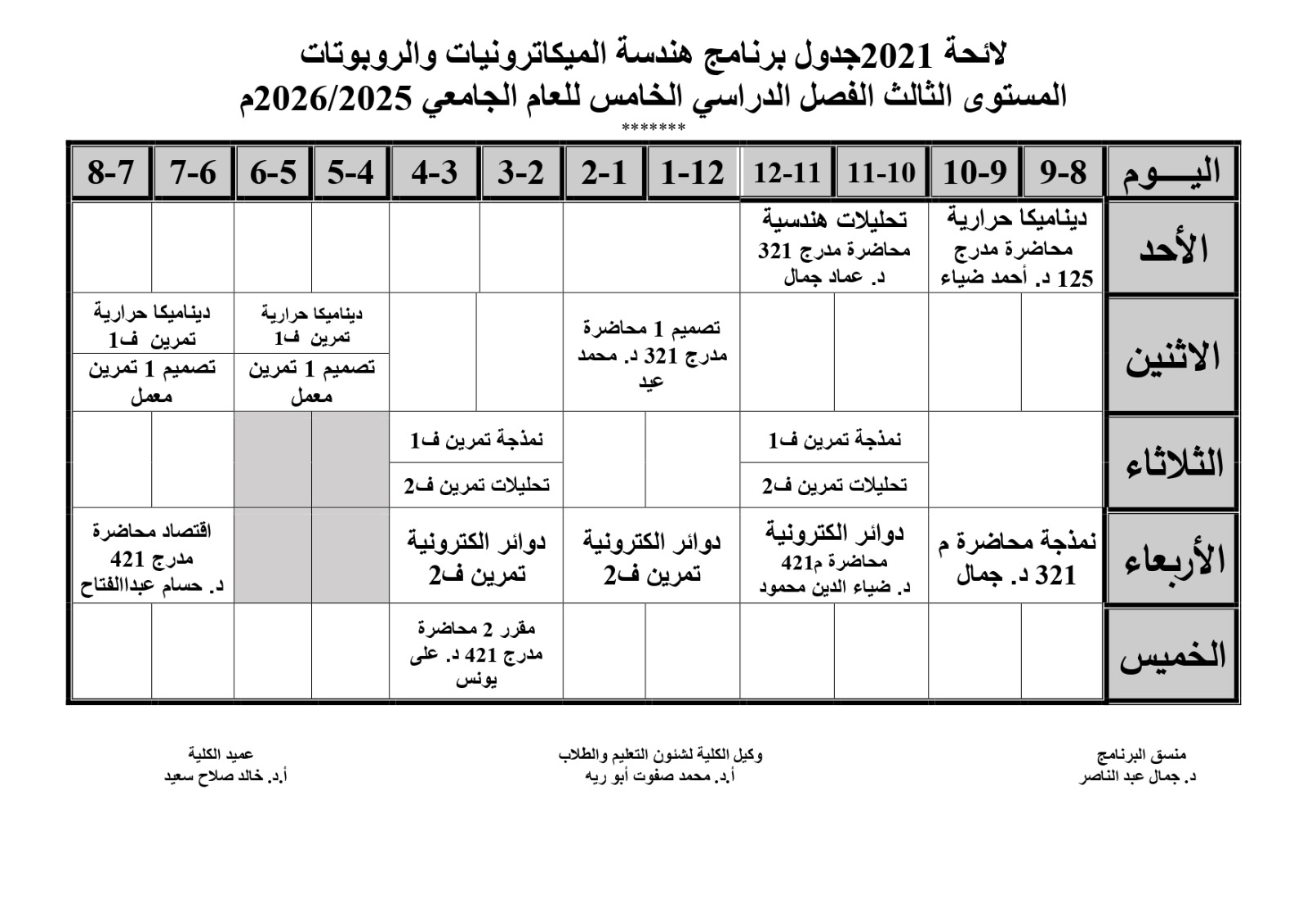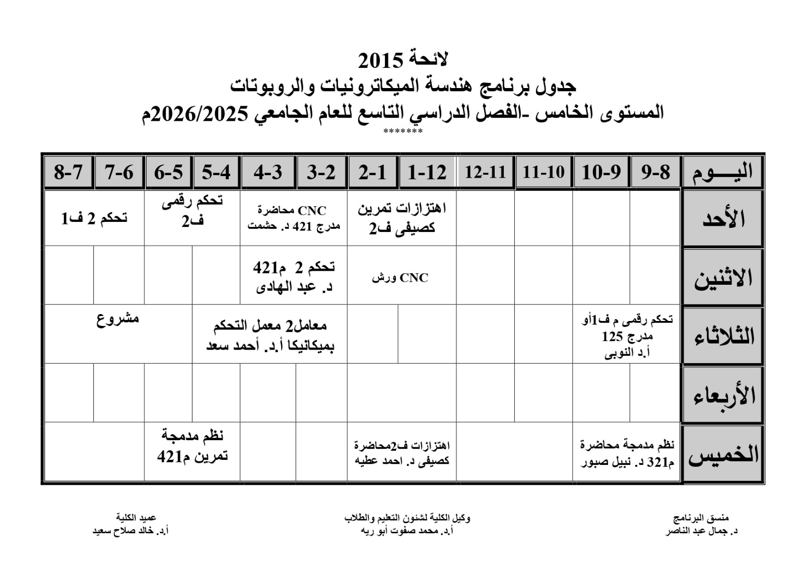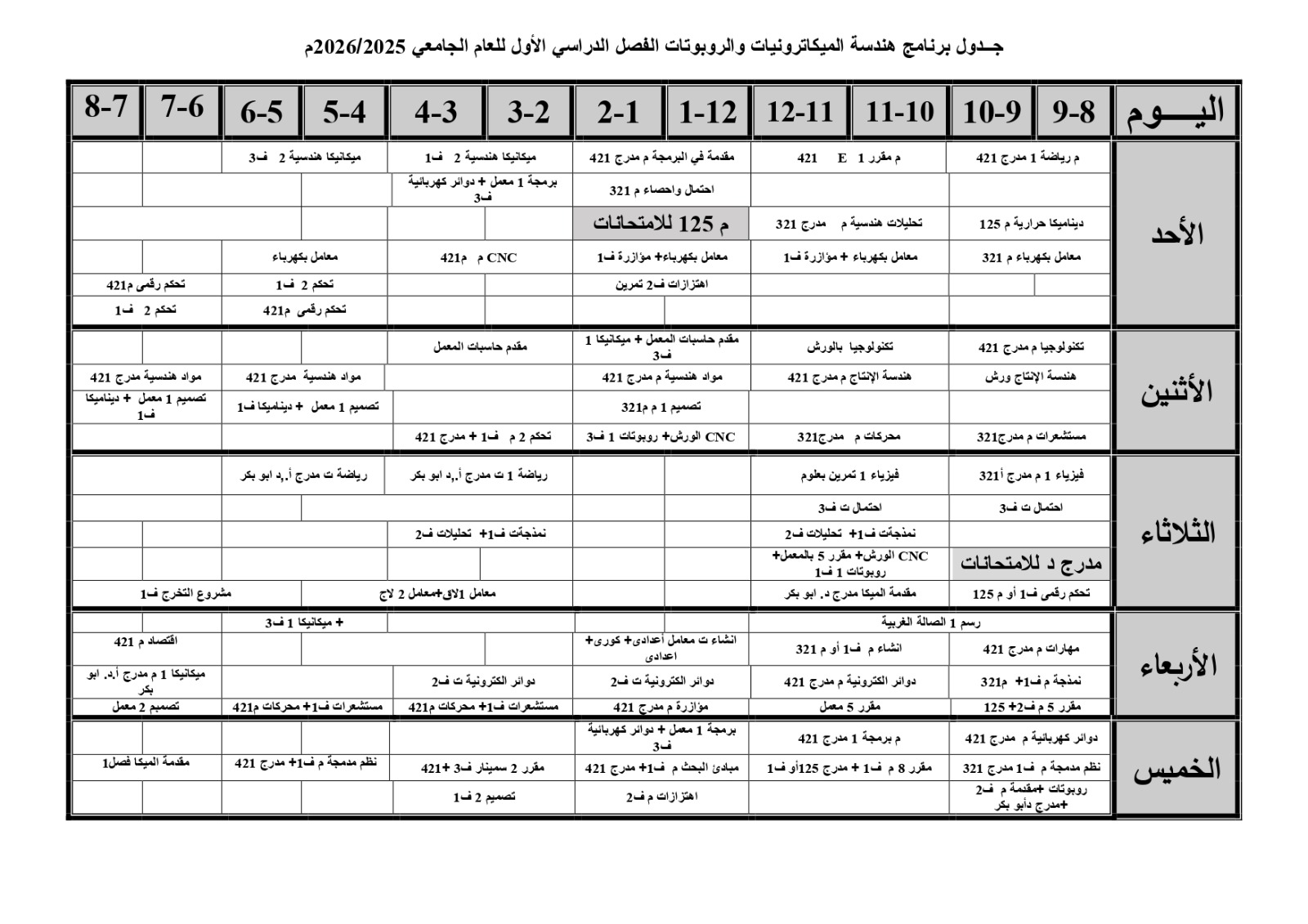 جداول برنامج هندسة الميكاترونيات والروبوتات