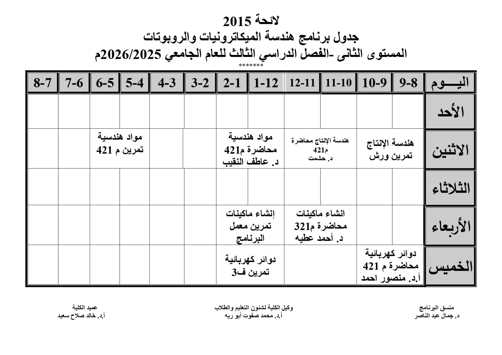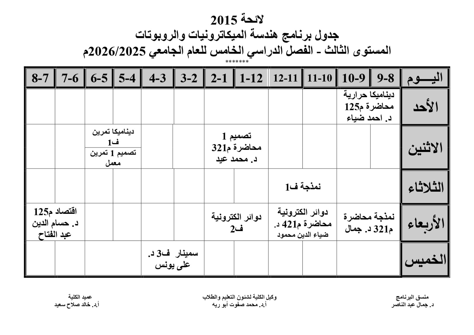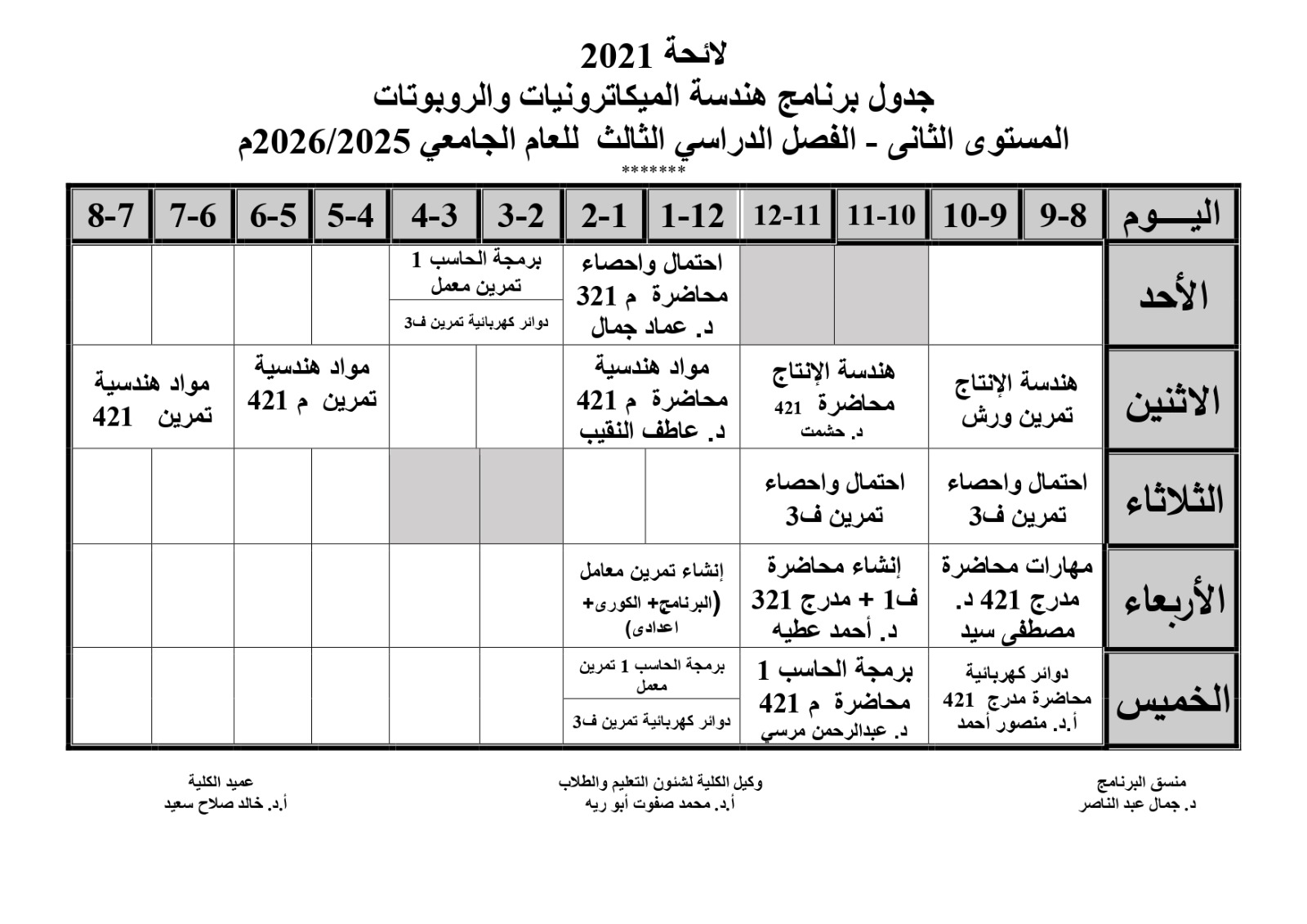 جدول برنامج هندسة الميكاترونيات والروبوتات المستوى الثانى للفصل الدراسي الثالث للعام الجامعي 2025/2026