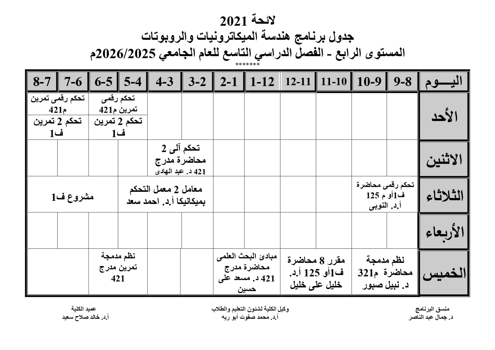 جدول برنامج هندسة الميكاترونيات والروبوتات المستوى الرابع للفصل الدراسي التاسع للعام الجامعي 2025/2026 م