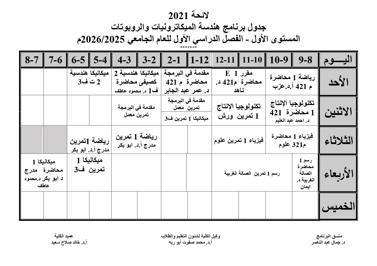 جدول برنامج هندسة الميكاترونيات والروبوتات المستوى الأول للفصل الدراسي الأول للعام الجامعي 2025/2026م
