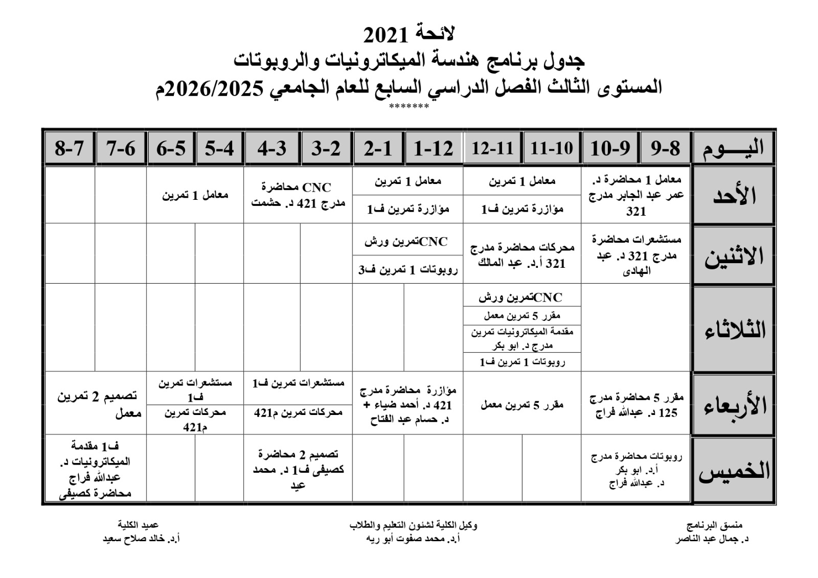 جدول برنامج هندسة الميكاترونيات والروبوتات المستوى الثالث للفصل الدراسي السابع للعام الجامعي 2025/2026م