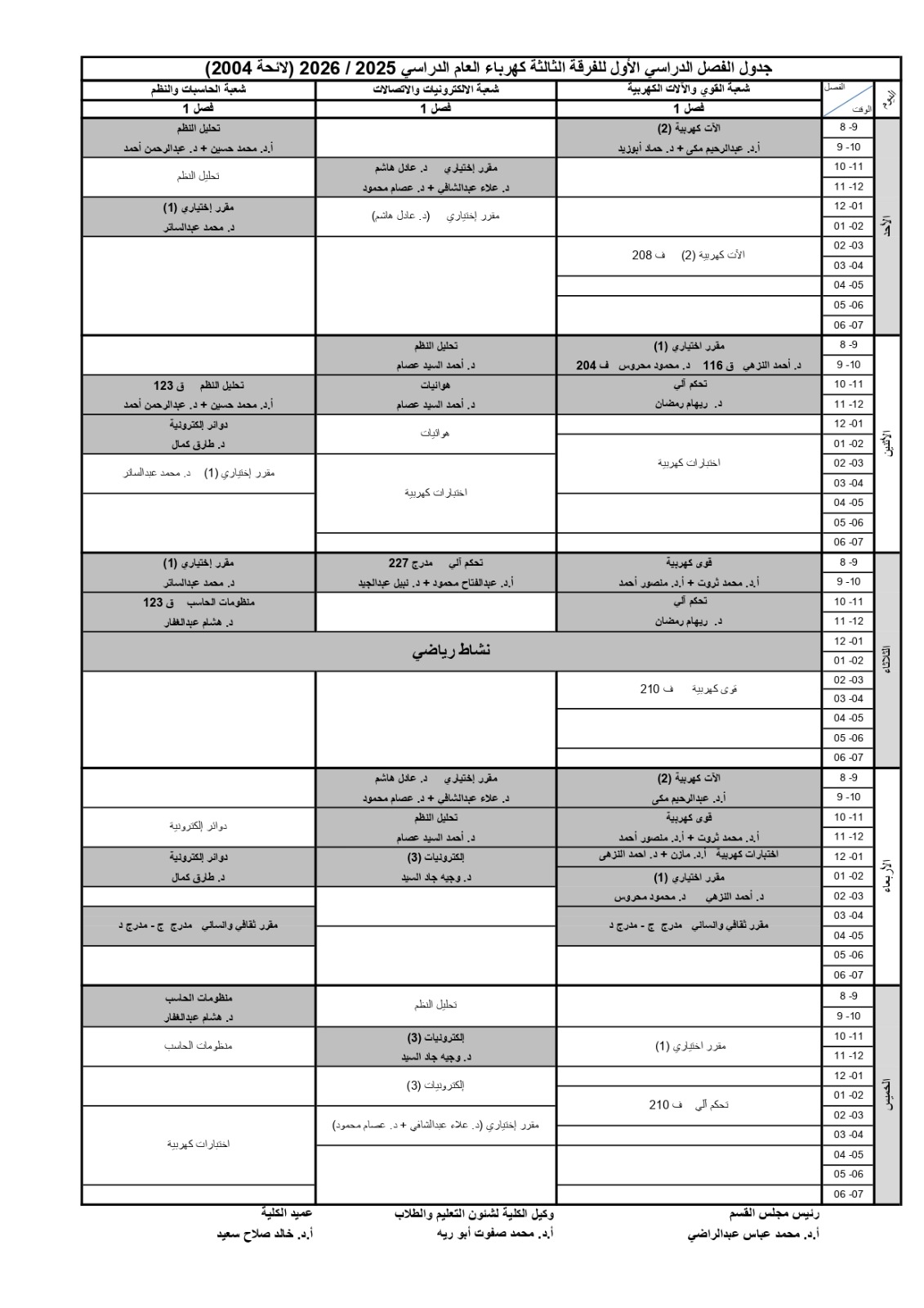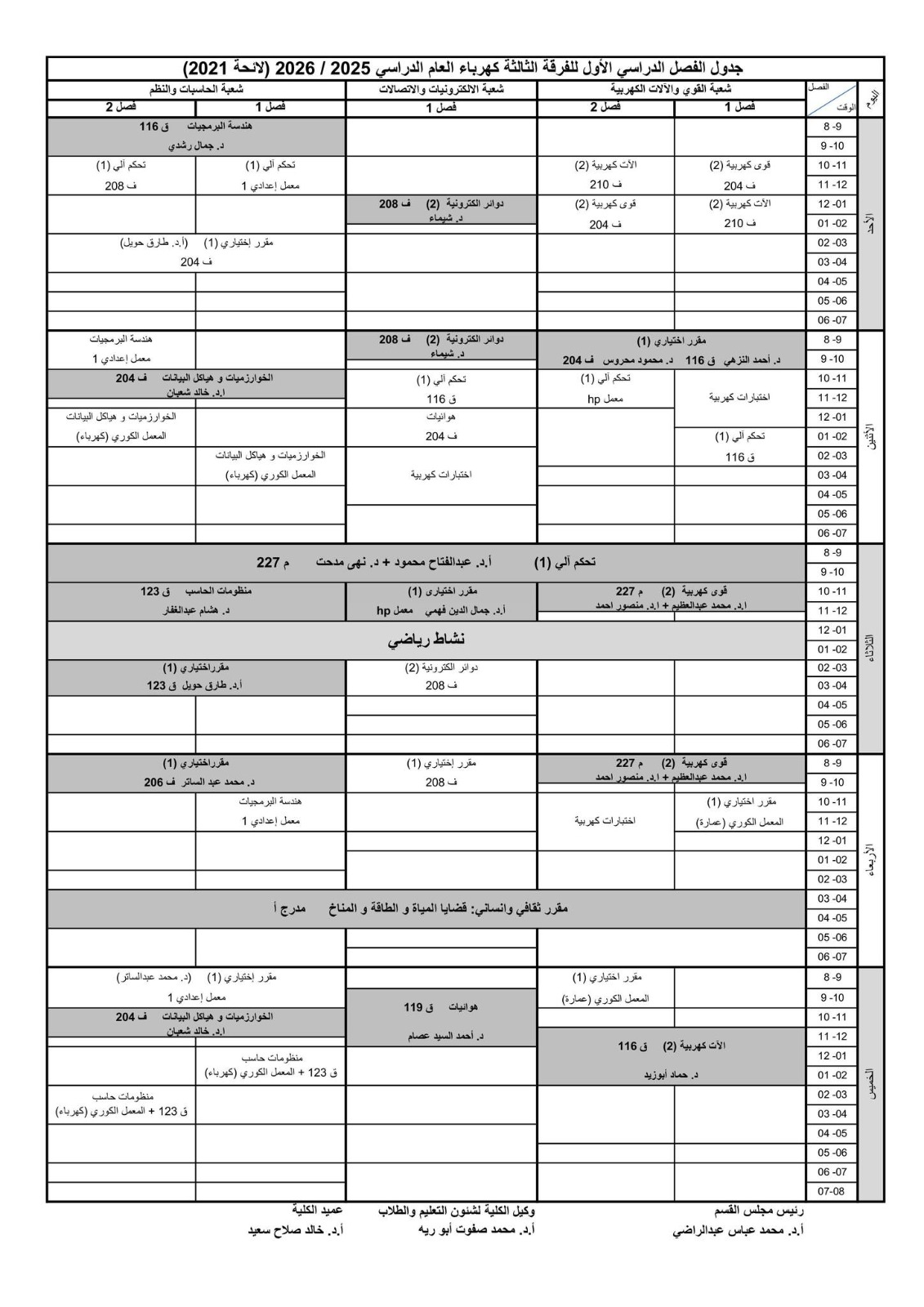 جدول الفرقة الثالثة هندسة الكهرباء للفصل الدراسي الأول للعام الجامعي 2025/2026م